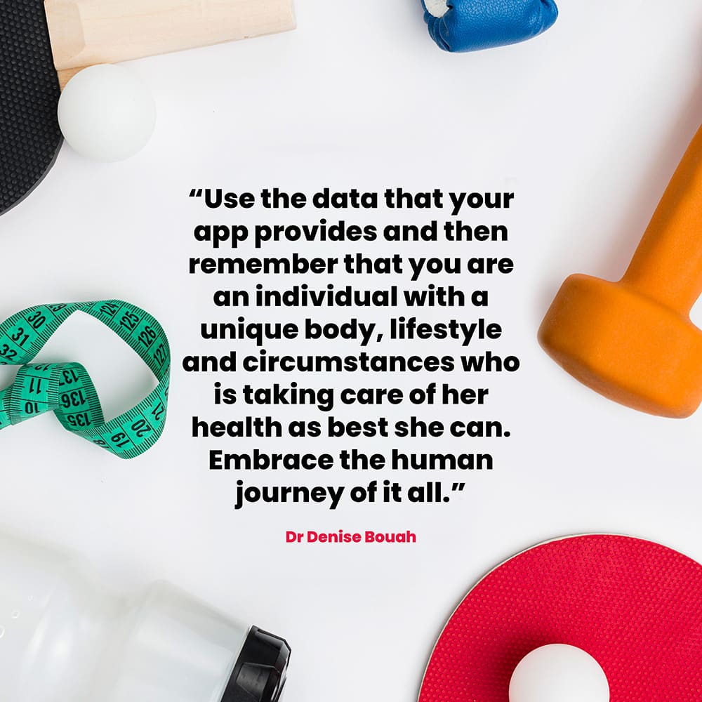 Life happens. Work gets busy. Children get ill. Energy fluctuates. “[Fitness] is a lifelong journey, and that is why we need to be flexible in our approach to health,” says Dr Bouah. “Use the data that your app provides – and then remember that you are an individual with a unique body, lifestyle and circumstances who is taking care of her health as best she can. Embrace the human journey of it all.”