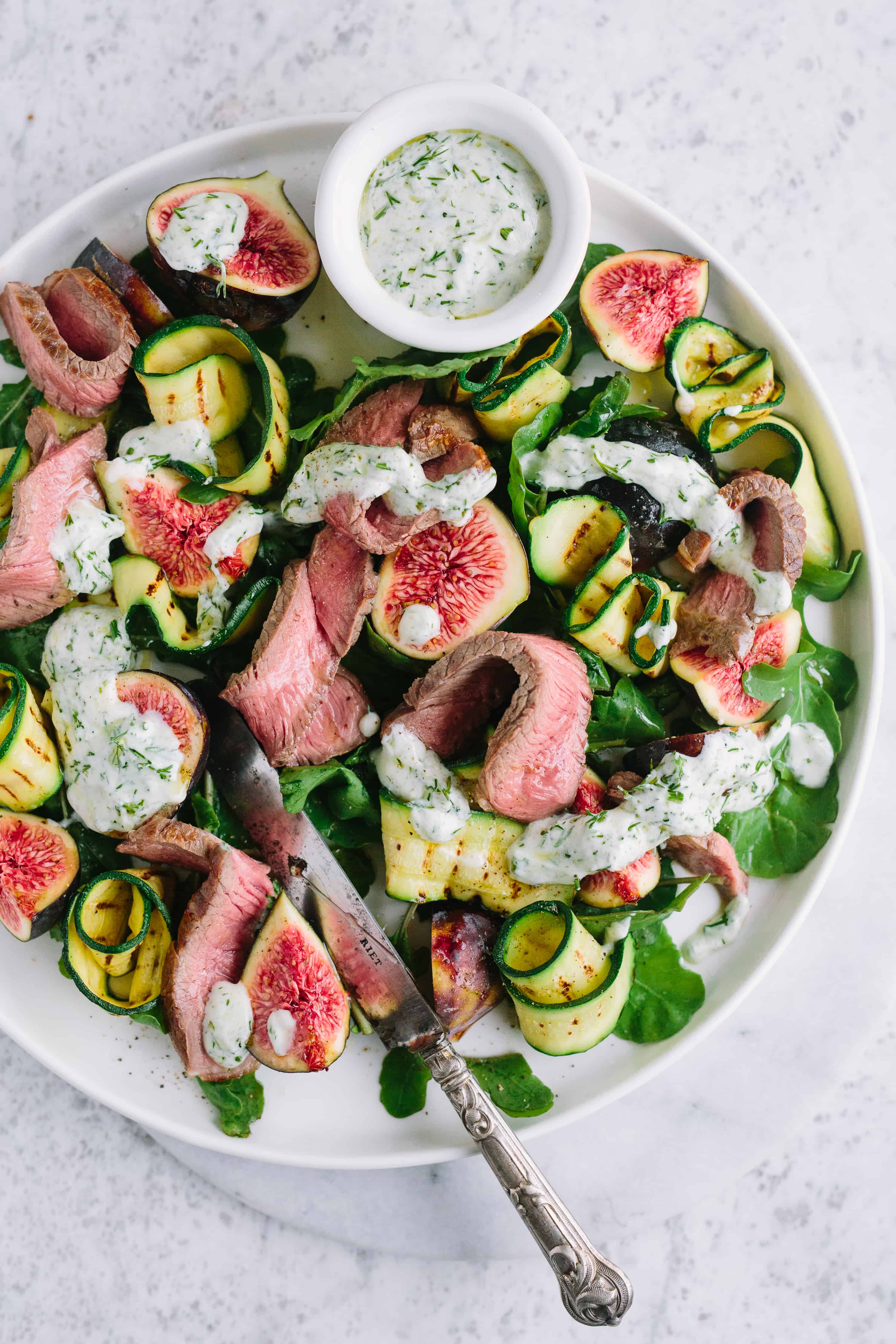 Lamb Steak Salad With Figs, Rocket And Grilled Courgettes With Yoghurt Dill Dressing
